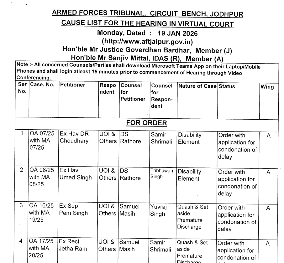 cause list of aft jaipur