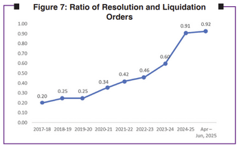 C.2 Ratio of Resolution and Liquidation orders: A number of initiatives are being taken to improve the outcomes of the Code. These include monitoring of cases pending for admission and ongoing CIRPs. Further, the IBBI revised its mechanisms for real-time sharing of information regarding applications for the initiation of CIRP with the IU. These initiatives have had a substantial impact on the IBC process, as evidenced by the increase in NCLTapproved resolutions and the admission of cases initiated by FCs. Figure 7 below highlights the improvement in ratio of number of cases ending with resolution vis-à-vis cases in which liquidation is ordered till the quarter April - June, 2025