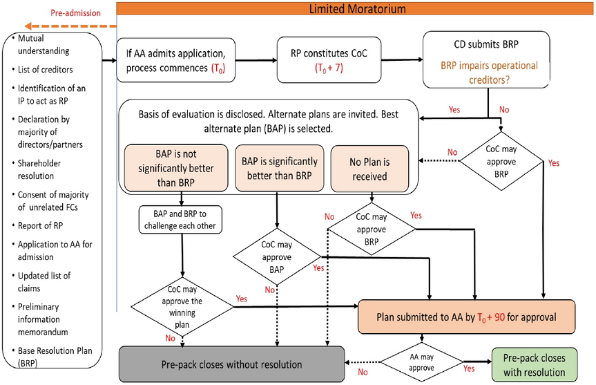 The flowchart summarises the typical process of a Pre-Packaged Insolvency Resolution Process (PPIRP), covering pre-admission requirements, commencements, constitution of the Committee of Creditors (CoC), submission of the Base Resolution Plan (BRP), invitation and evaluation of the Best Alternative Plan (BAP) and Approval or rejection by the CoC.[5]