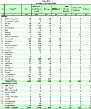 The National Crimes Records Bureau publishes an yearly publication called Crime in India. The only available data on witch-hunt violence under NCRB relates to witch-craft motivated murders. For instance, as per the NCRB reports, the witch-craft motivated murders in Jharkhand were at 22 in 2023, 14 in Madhya Pradesh and 19 in Chhattisgarh.